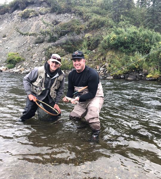 Fly fishing guide Reece Campbell and Mike Elkington of Eielson Air Force Base with his latest catch