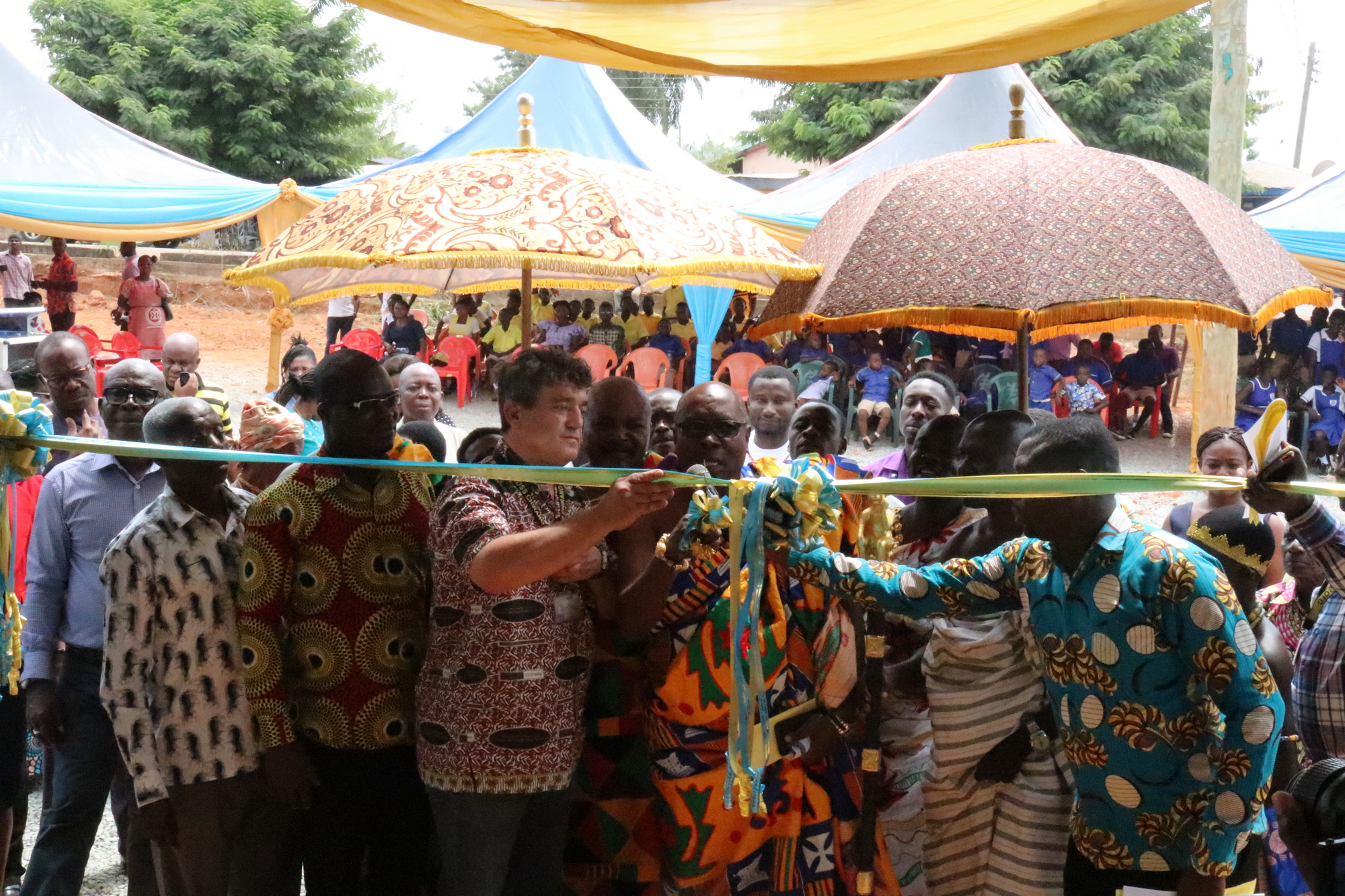 Adriano Sobreira, Vice-President and General Manager, Chirano, cuts the ribbon at the ICT grand opening ceremony with community members
