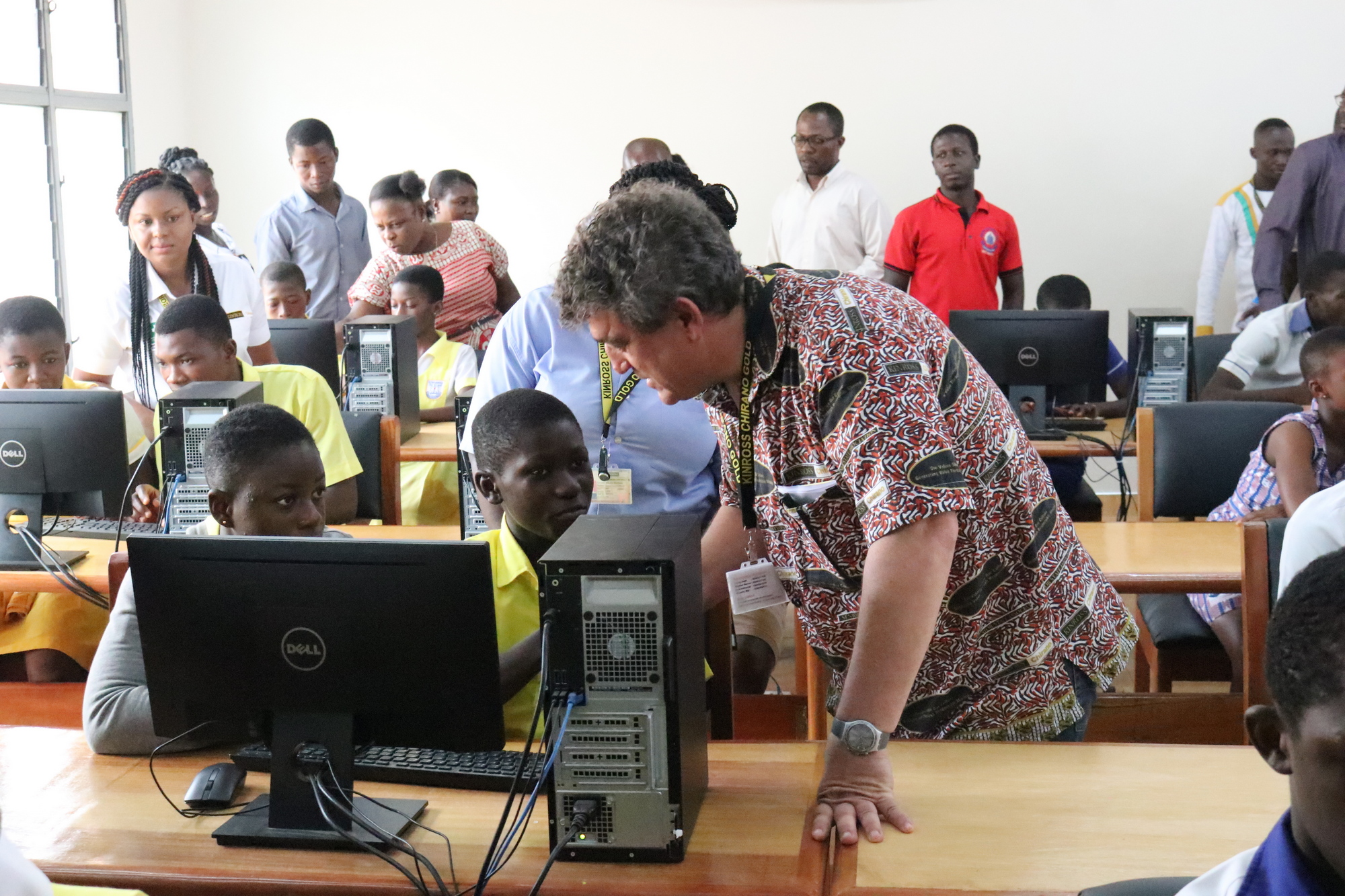 Adriano Sobreira, Vice-President and General Manager, Chirano, works with students at a computer