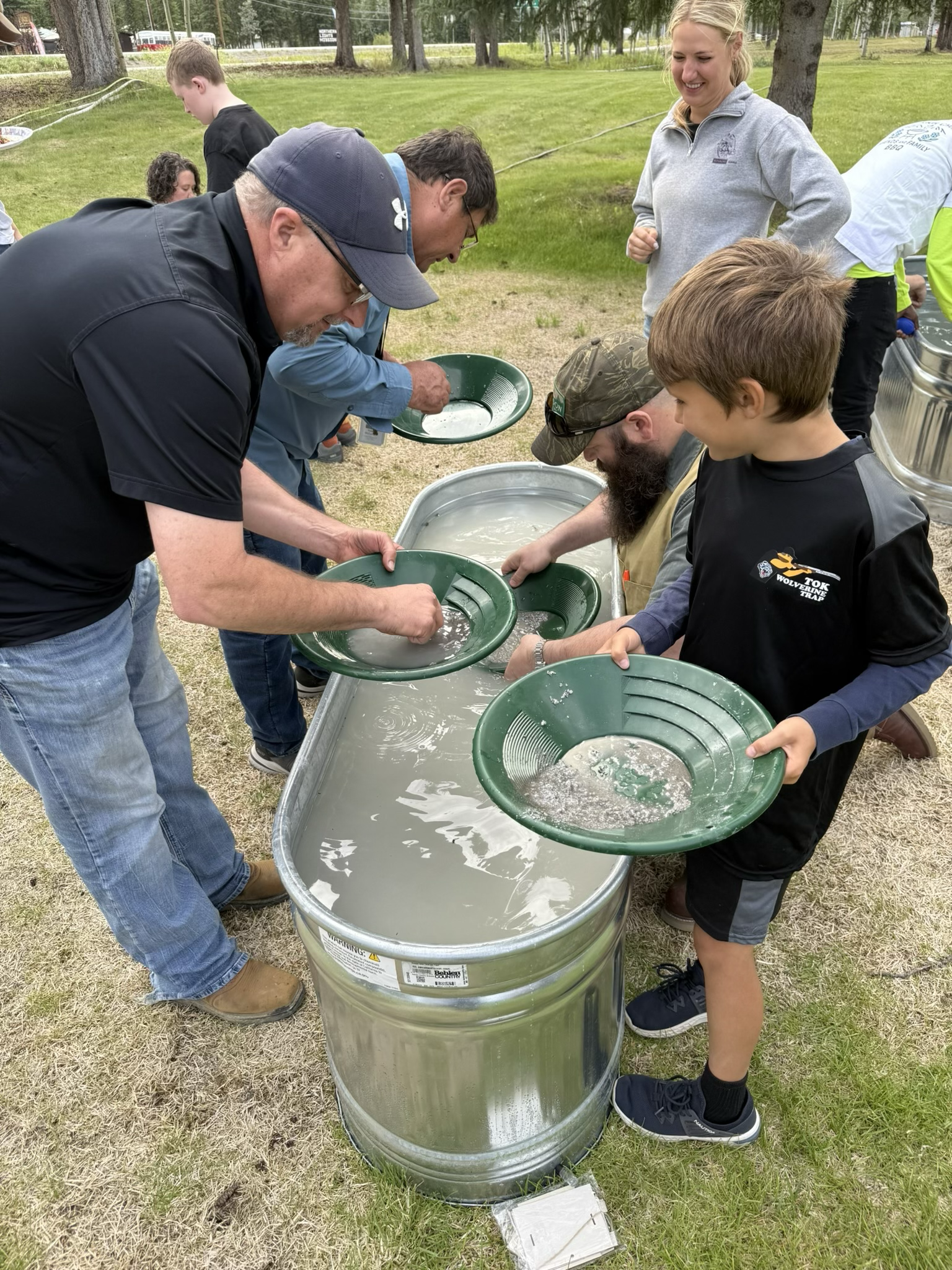 Members of the geology team at Manh Choh volunteer to instruct attendees on gold panning techniques at the Tok BBQ